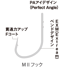 マス針特有の折れに対し、粘り強いマテリアル選定を行い貫通力アップのポイントデザイン&フッ素コートがこのモデルの礎。シャンクに備えた2本のケンが縫い刺し時の高いホールド性を保持することになり、ワームが本来持つアクションを生かします。